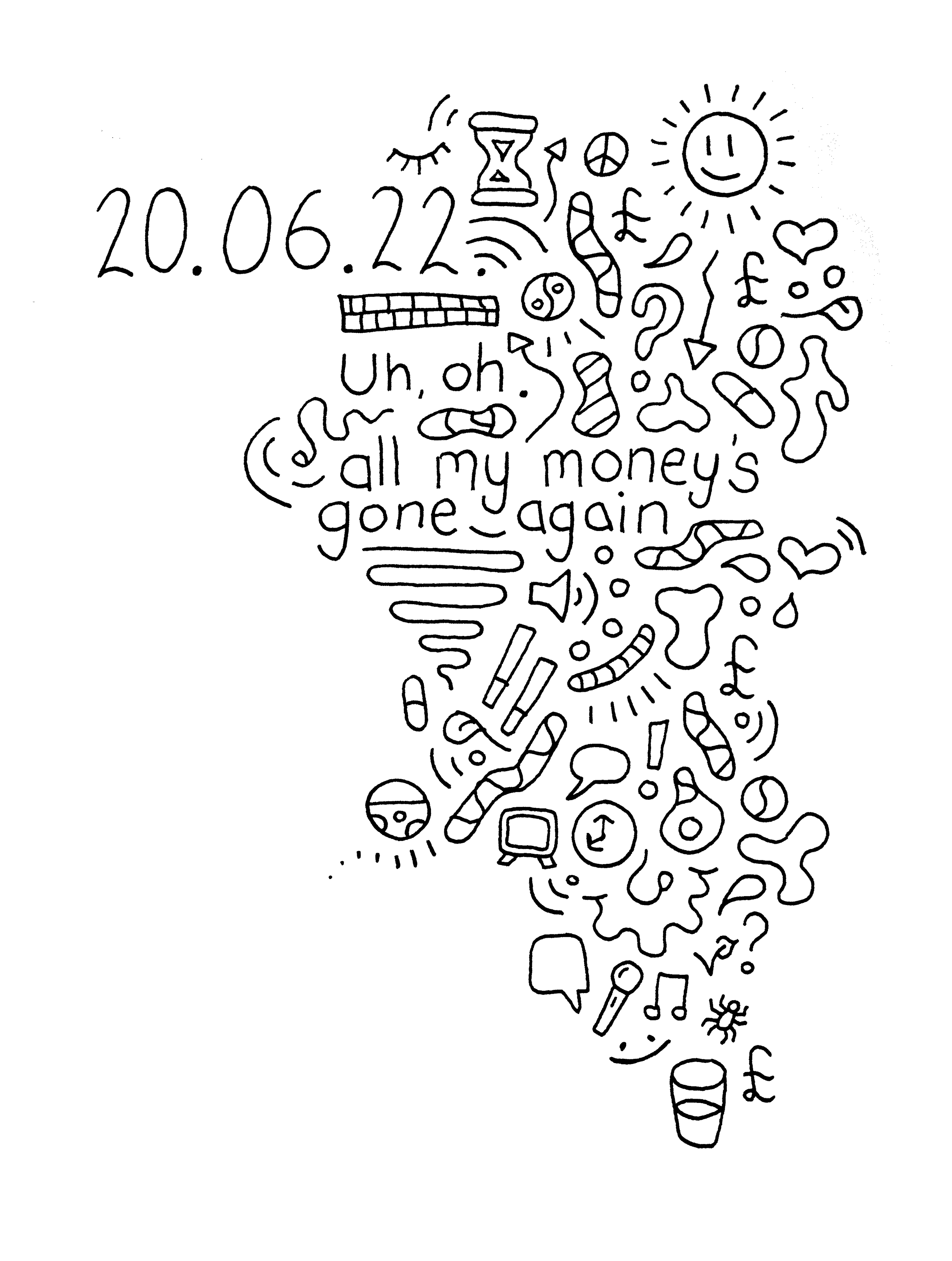 For this exercise you may wish to start with your eyes closed and meditate for a moment, or you may want to start doodling straight away. As you meditate or doodle, allow your thoughts to flow. When a thought you see as significant or telling of your current emotions arises, write this onto your page. It can be a single word which springs to your mind, or a sentence, or a few; whatever feels right. Typically, if you feel you have had the same thought multiple times during the day, this is something significant to you currently. It is important not to second guess yourself, whatever your first instinct for your word or sentence is, trust that and write it down, no matter how silly or insignificant it may seem. This stops the critical brain from questioning whether it is the ‘best’ thought to include and allows you to simply get the thoughts down.